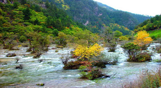 ![]() ![]() 在金黃、銀白的鈣化灘流上有一層薄薄的水,在水中生長著許多喜愛水性的植物,有杜鵑、楊柳、松樹、柏樹、高山柳等。它們在水中擺出各式各樣的造型,有的婀娜多姿、有的蒼勁挺拔,并且在每一株樹下都有一個盆狀的鈣化堆積,灘中又有怪石點綴其中,加之又無人工雕琢,使這一株株樹木有如盆景一般矗立在水中,惹人喜愛、逗人喜歡。這正是告訴大家九寨之美在自然之美。